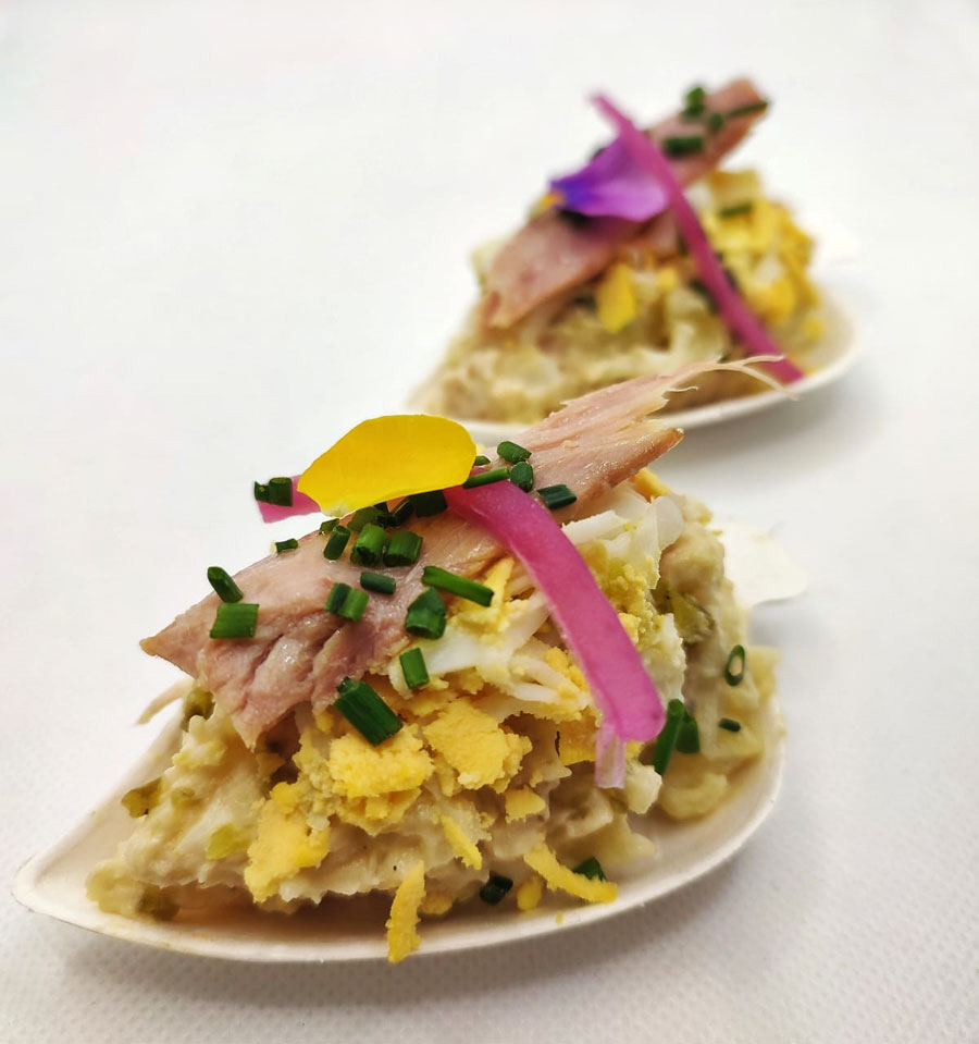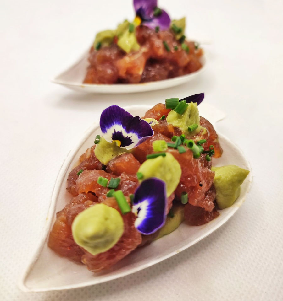 Caja de cucharita de tartar de atún con aguacate y mayonesa de kimchy