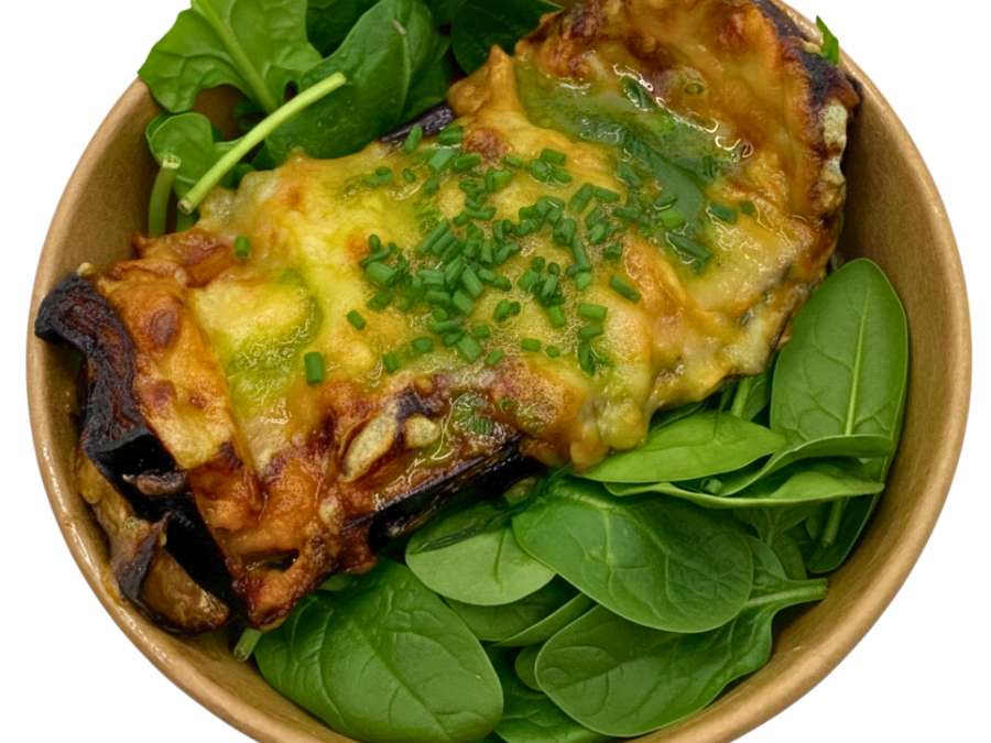 Berenjena rellena de boloñesa de pollo y parmesano