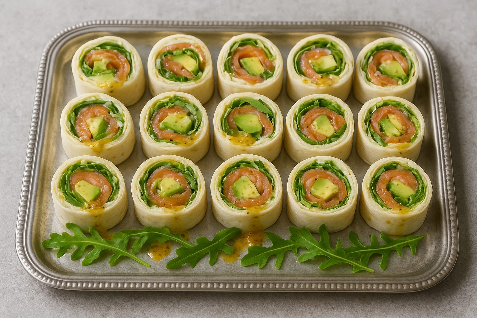 Caja de Rolls de pan polar con salmón, aguacate, rúcula y olivas.
